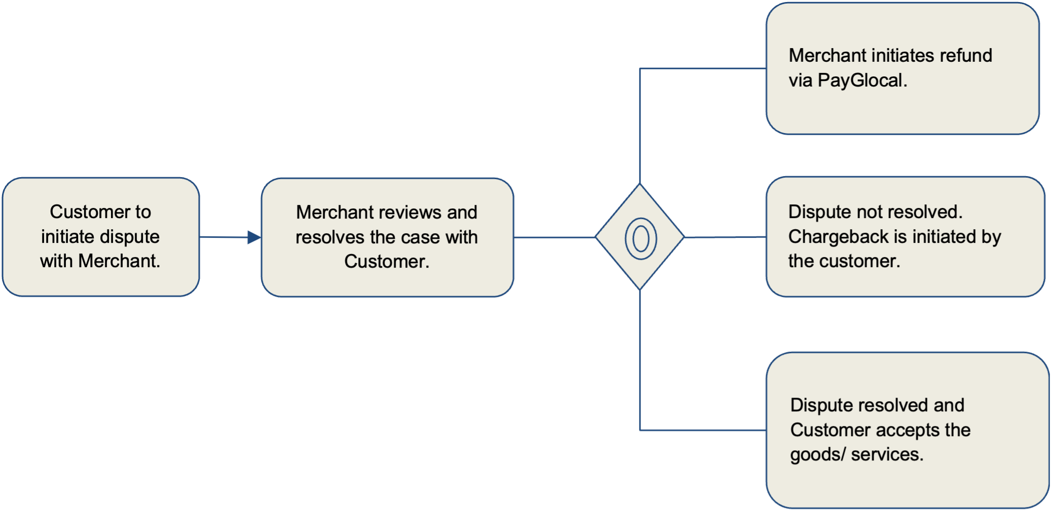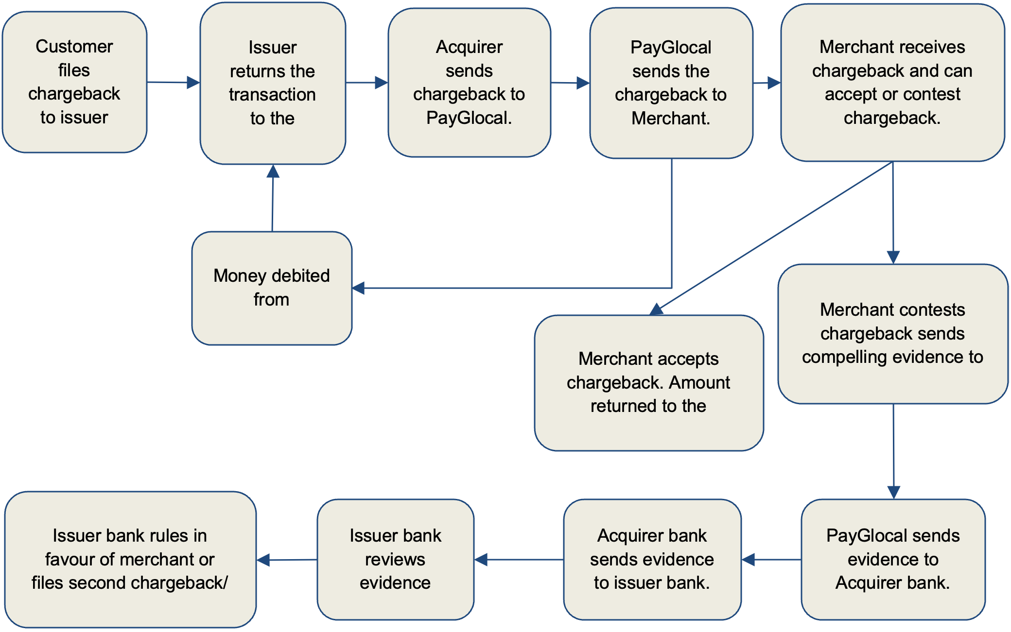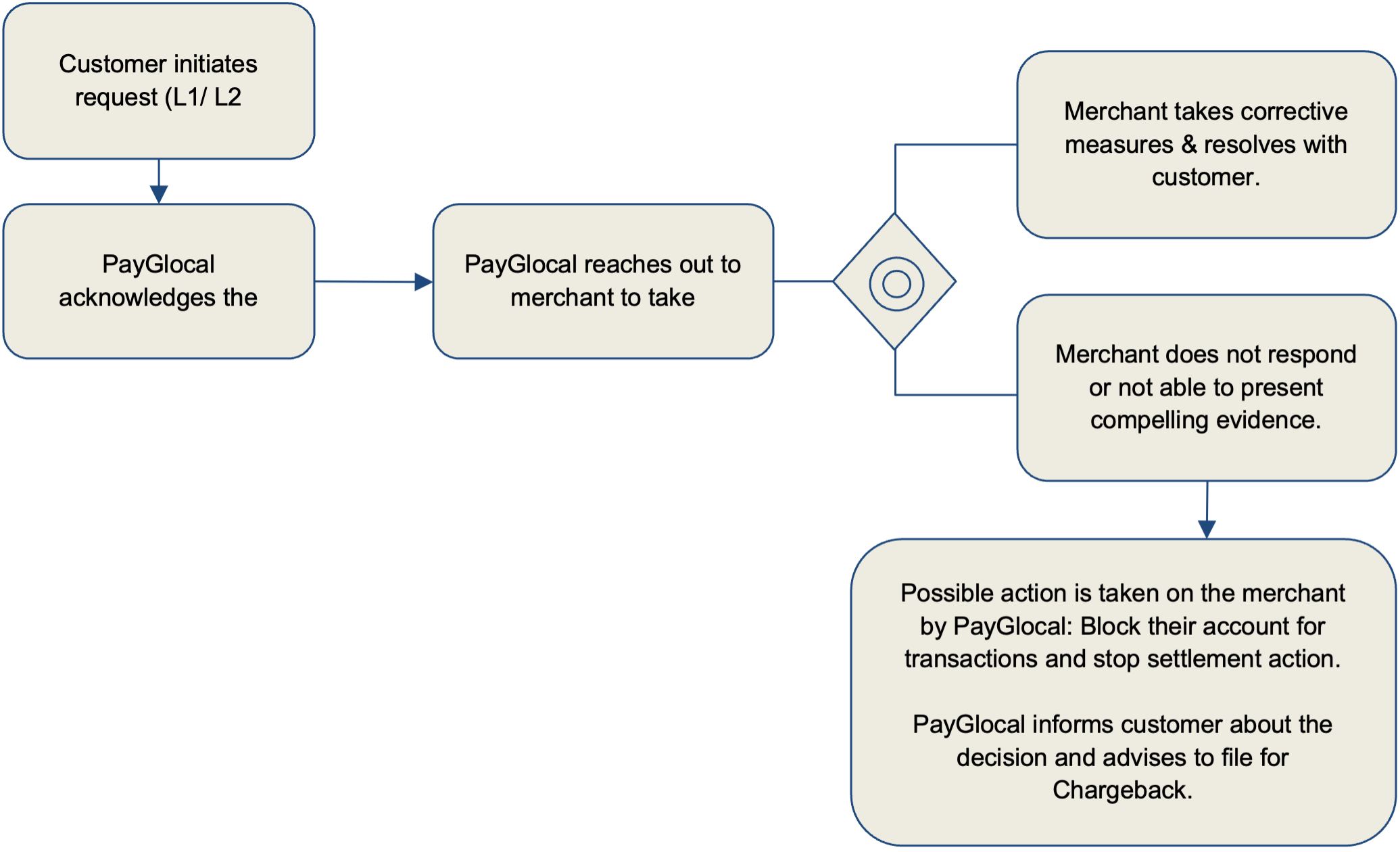 If the Customer has received a response back from the Merchant and is not satisfied with their response, the Customer can raise a chargeback with their issuing bank (for card payments). These Chargebacks will be raised with PayGlocal by the Customer’s issuing bank and PayGlocal will provide support to resolve the issue as per the chargeback guidelines.