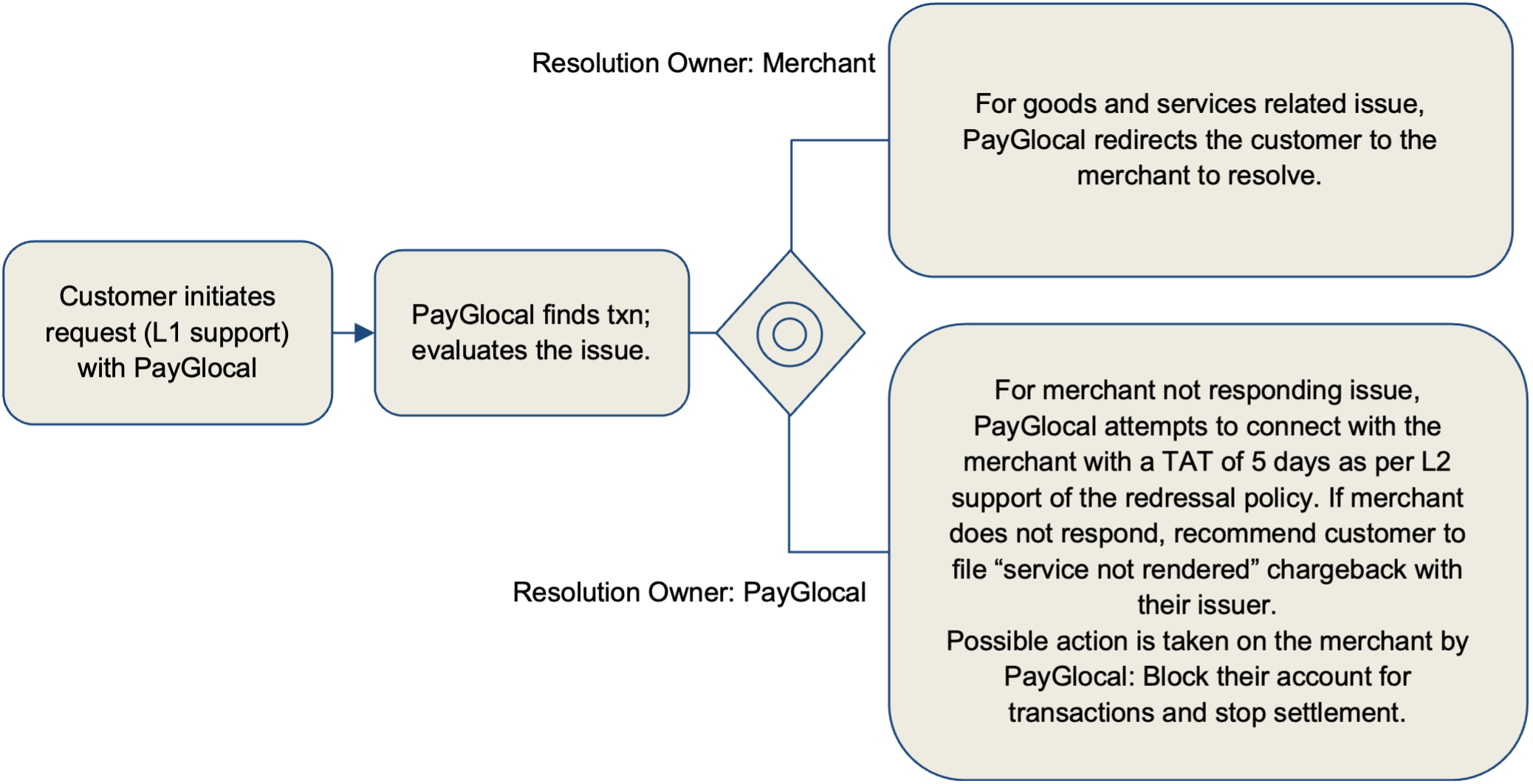PayGlocal defines a robust framework to manage disputes/grievances. This framework gives an overview of the transaction lifecycle of PayGlocal system and handles issues faced by Customers and Merchants separately, with resolution guidelines specified for each dispute type. The Customer/Merchant is expected to read and understand the dispute type and resolution ownership of their grievance to receive appropriate redressal support from PayGlocal.